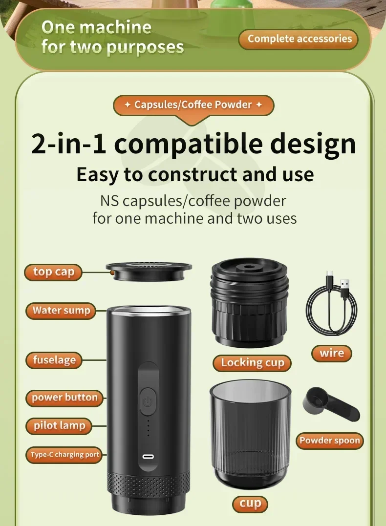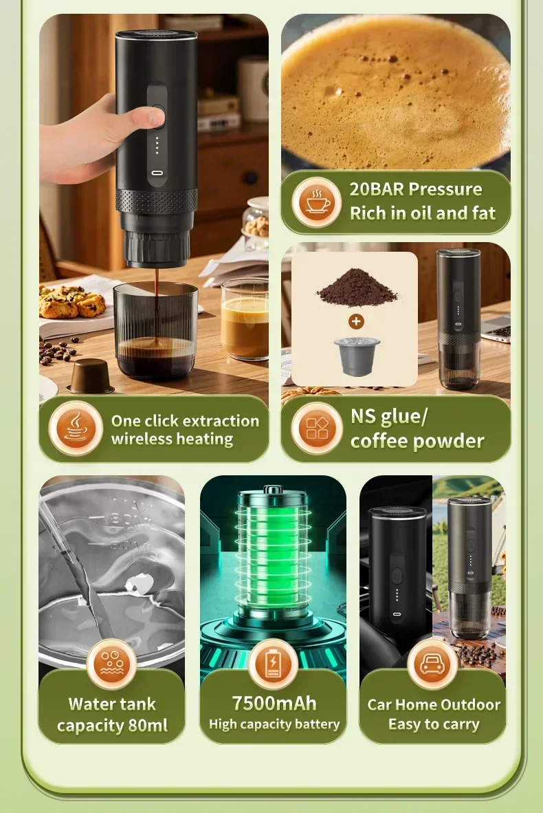 TINSOL New 3 in 1 Wireless Portable Espresso Machine Capsule Coffee Powder Travel Coffee Maker Smart Extraction Wireless Heating
